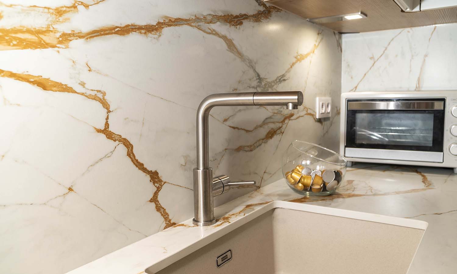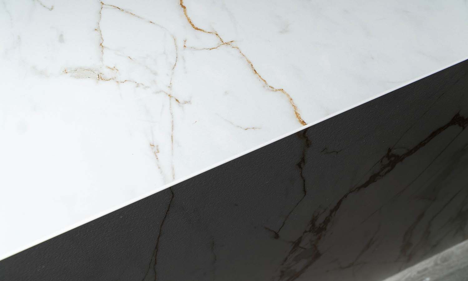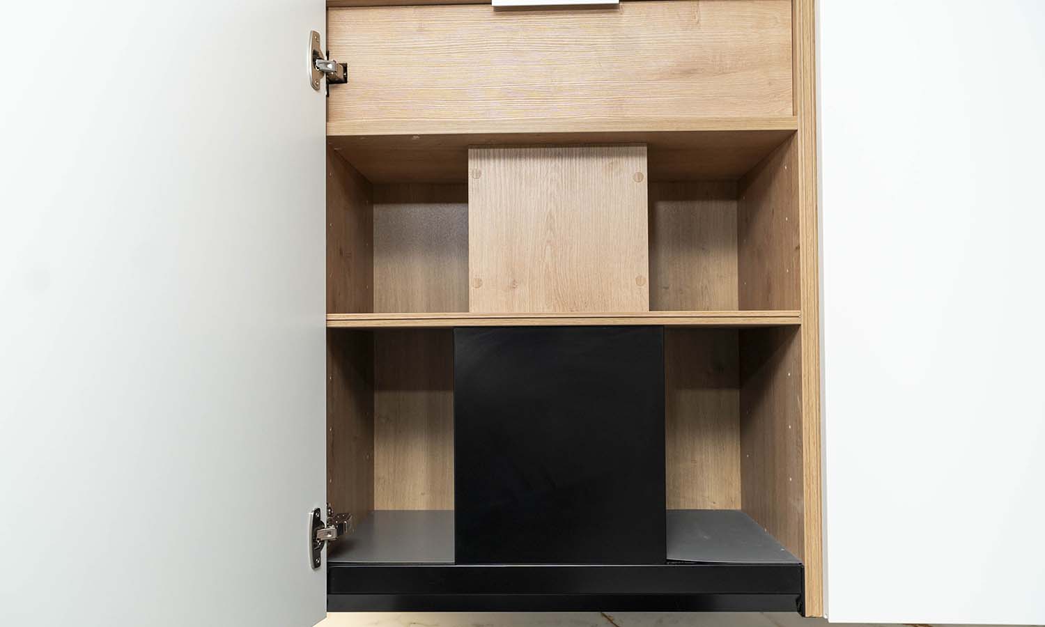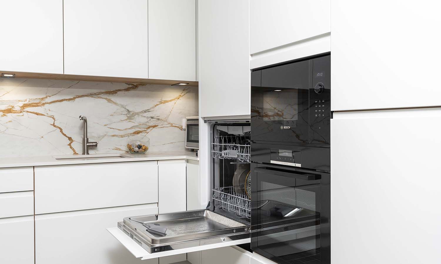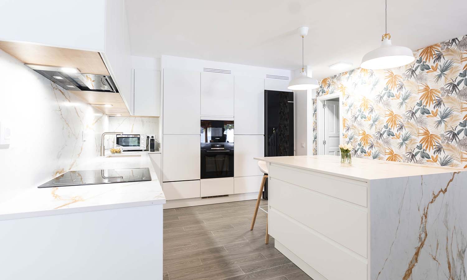 Los electrodomésticos de gama superior elegidos cuidadosamente en acabado cristal negro para ofrecer el contraste perfecto, destacando el lavavajillas en despensa para mayor comodidad y campana completamente oculta.