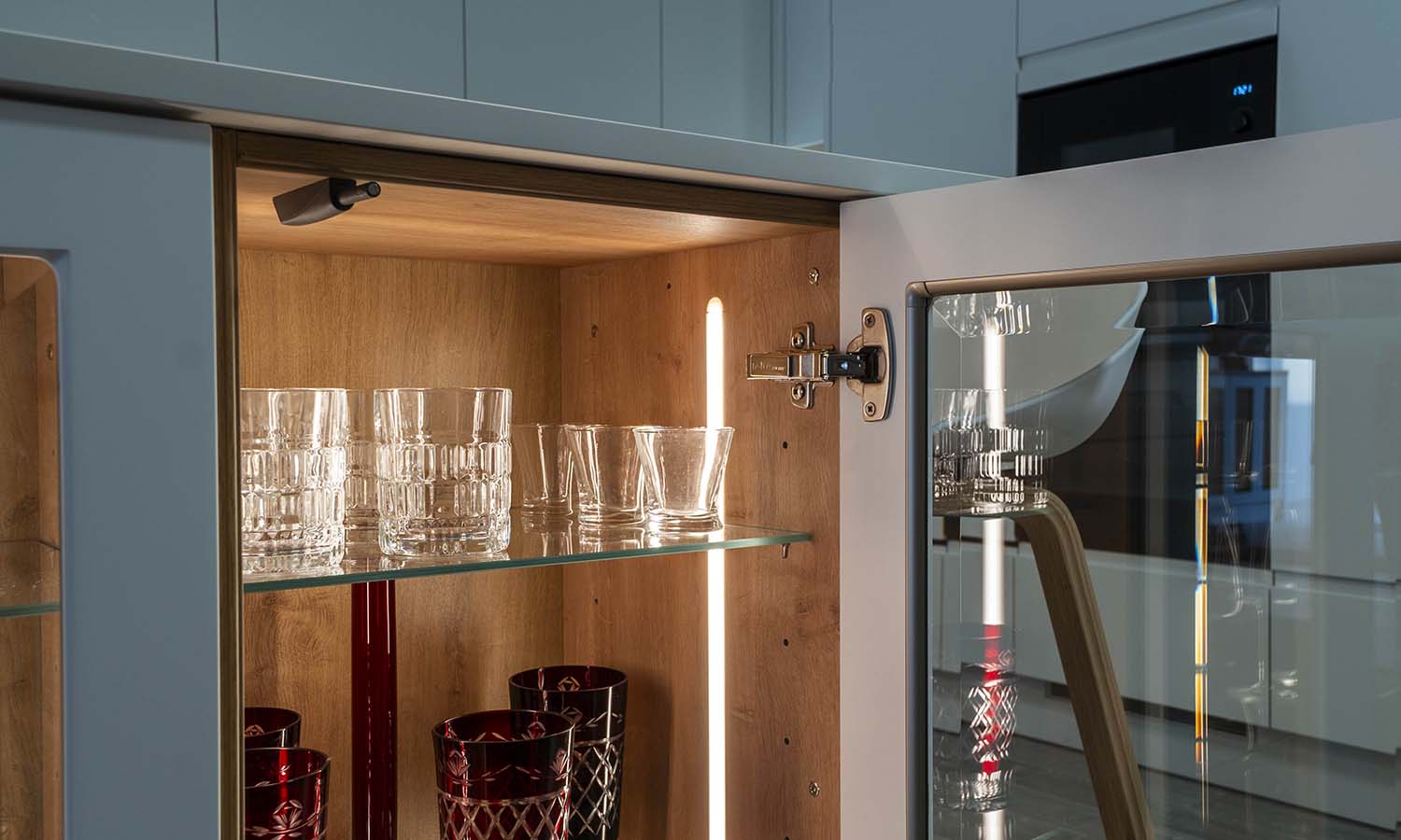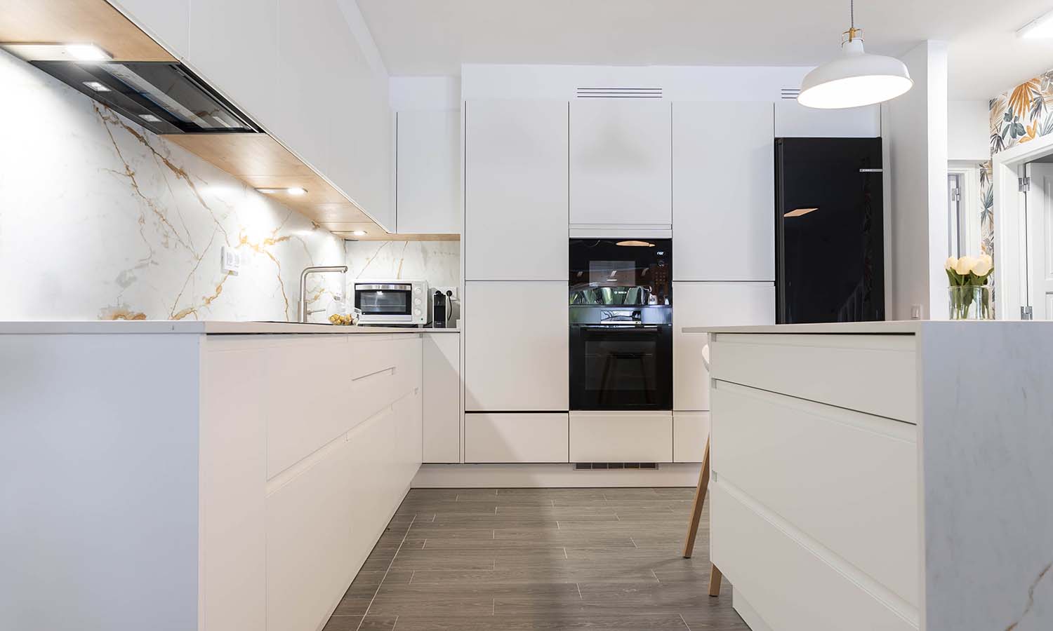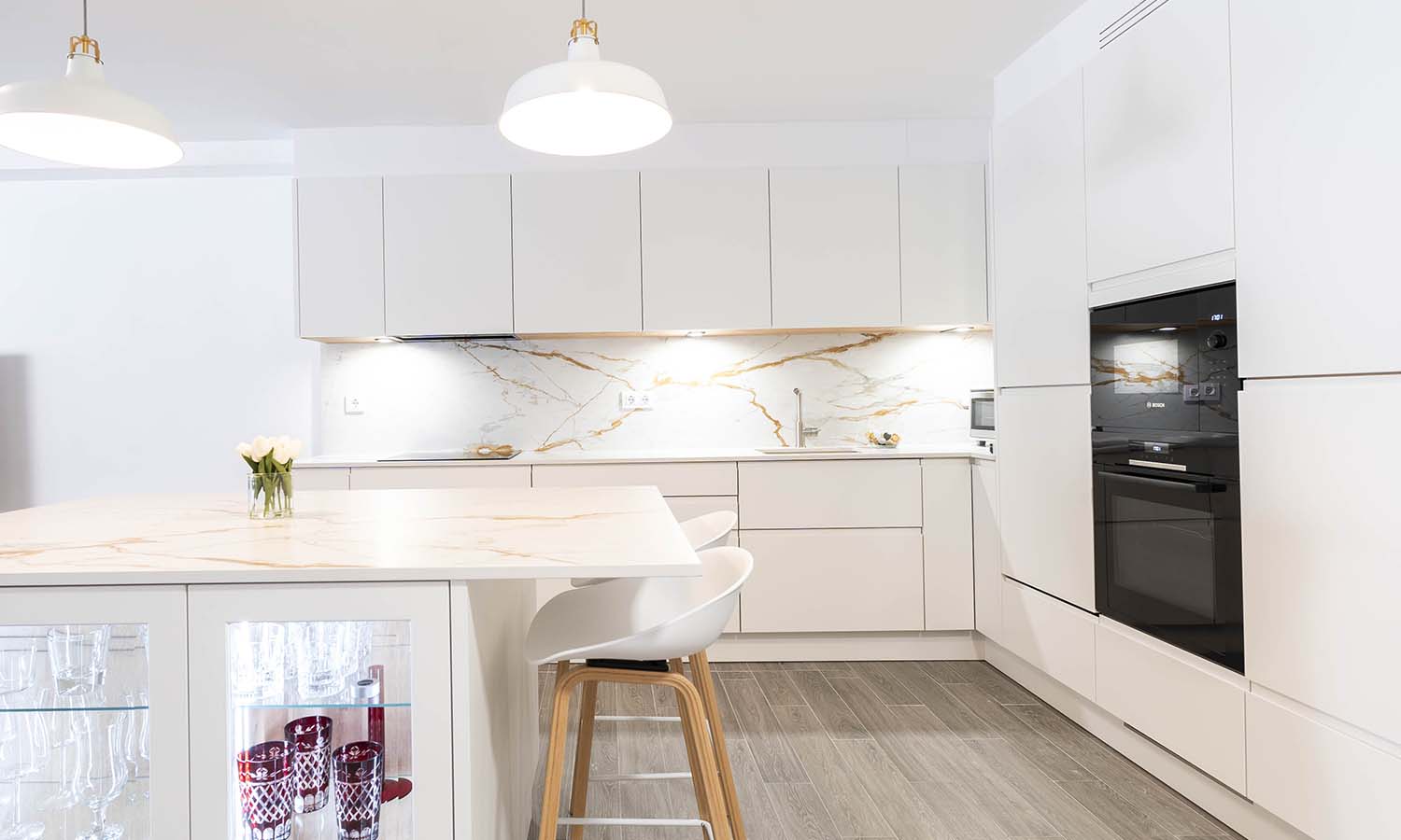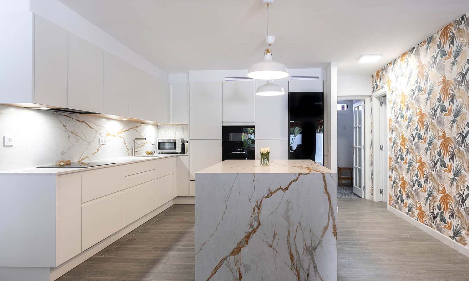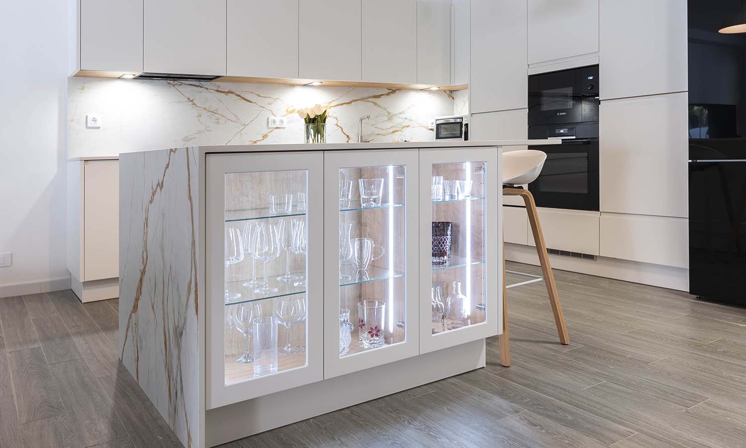 Les presentamos el resultado final de esta cocina muy especial, con los frentes lacado fino en blanco mate, junto con la naturalidad que aporta la encimera y en combinación de vitrinas transparentes con iluminación integrada, aportando mucha personalidad y calidez al hogar donde estamos seguros que pasarán increíbles momentos.