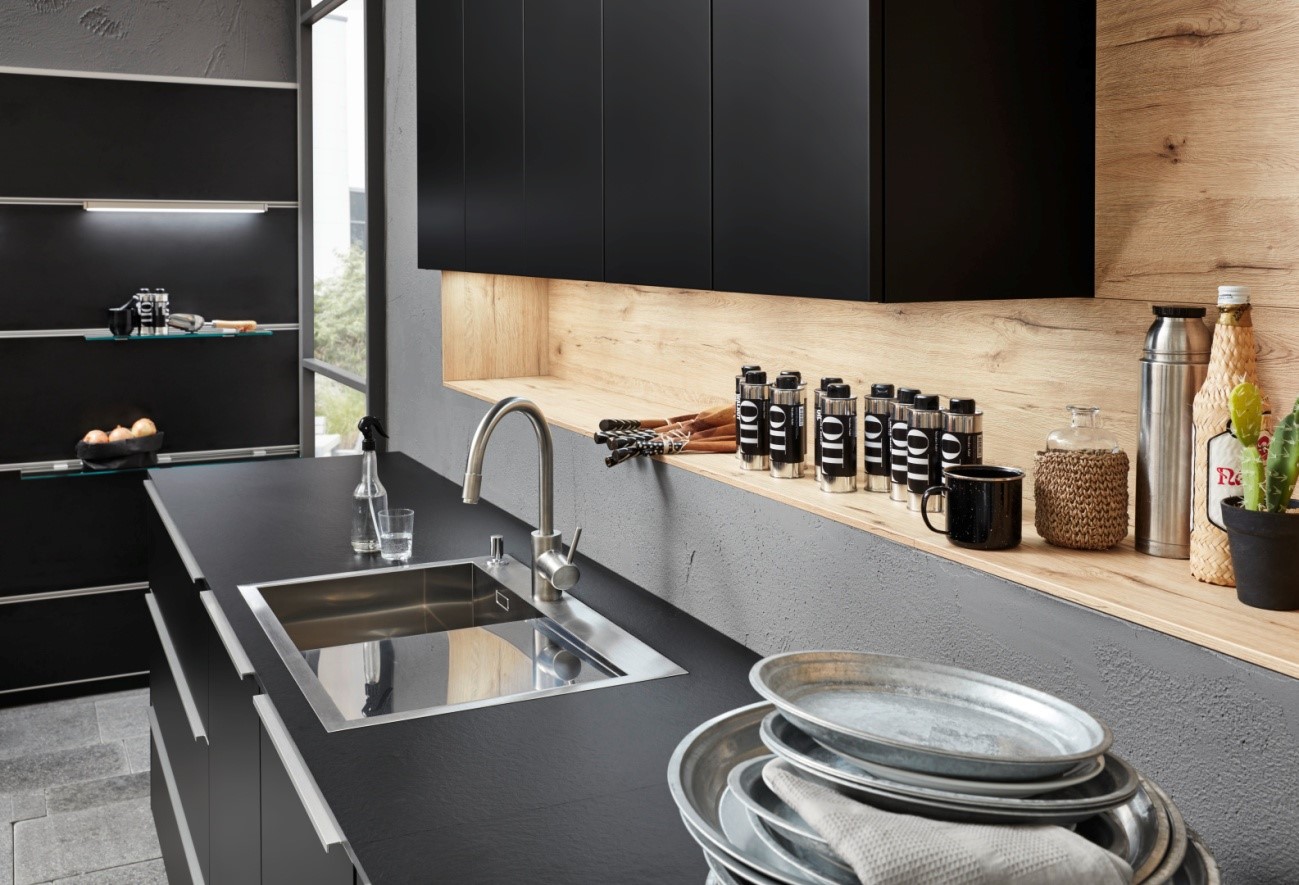 El sencillo negro mate de la superficie de laca genuina destaca de especial manera el precioso veteado y cálido tono de la imitación de madera, poniendo toda la cocina en escena con gran estética y máxima perfección.