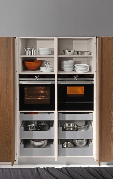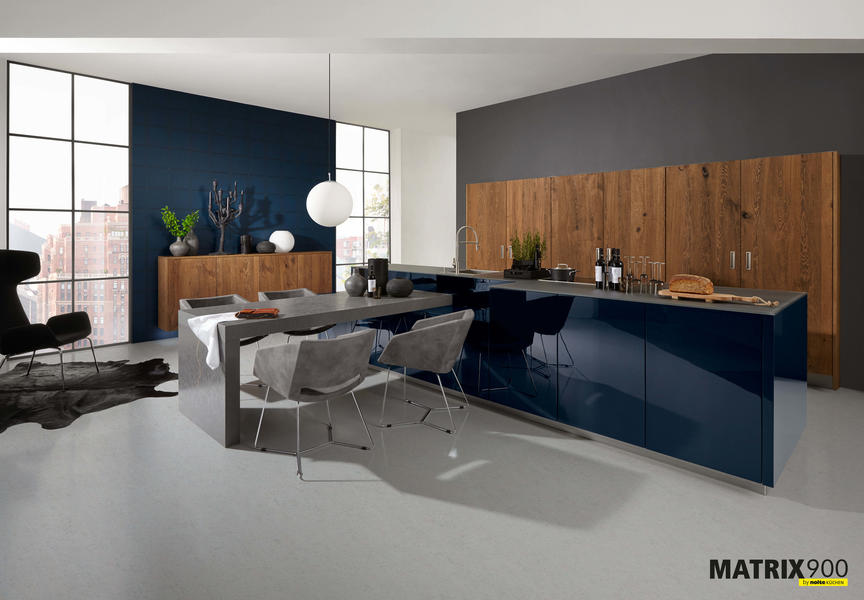 El roble color trufa con su noble superficie de madera auténtica hace que esta cocina atraiga todas las miradas.