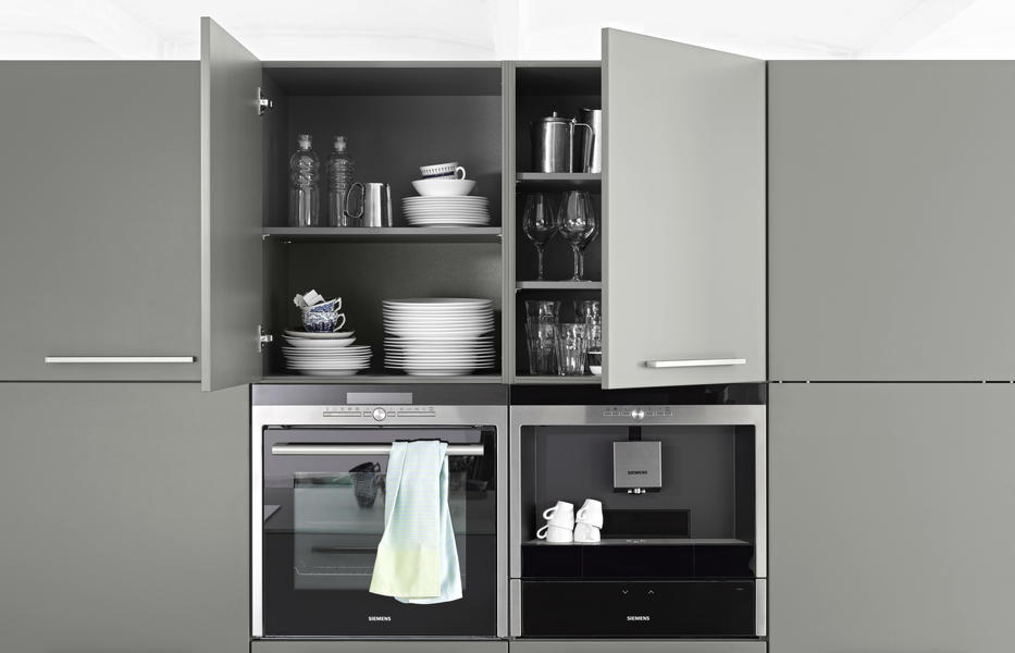 Frentes de laca mate en combinación con una encimera de vidrio logran un aspecto tranquilo y urbano, que subraya la amplitud aérea del espacio. Soluciones de almacenamiento sofisticadas que confieren orden y logran un entorno ordenado y sosegado.