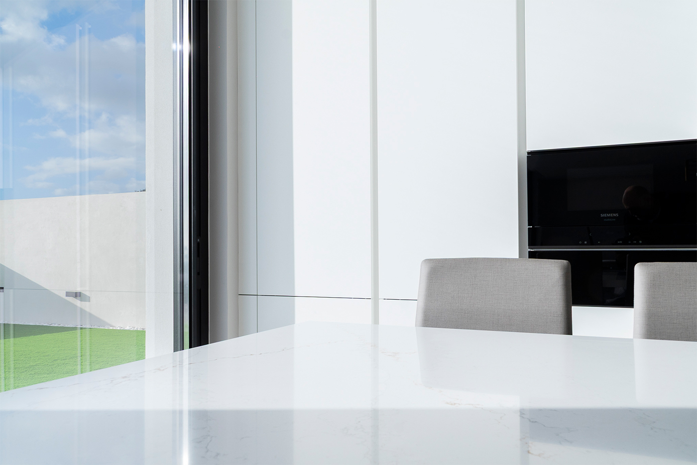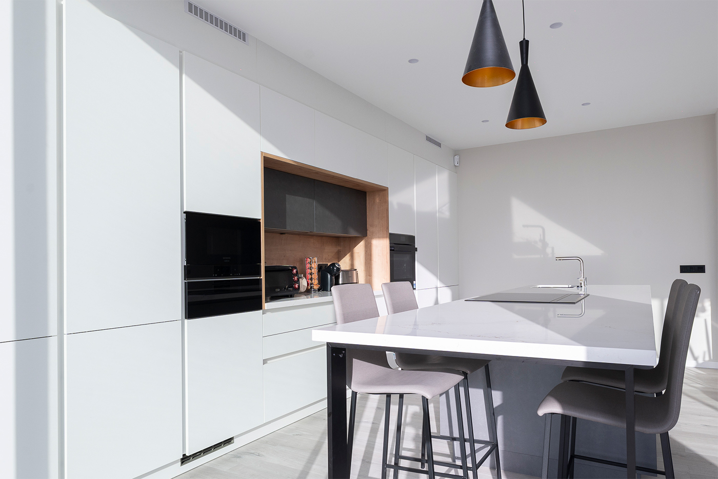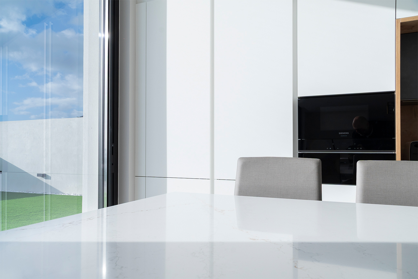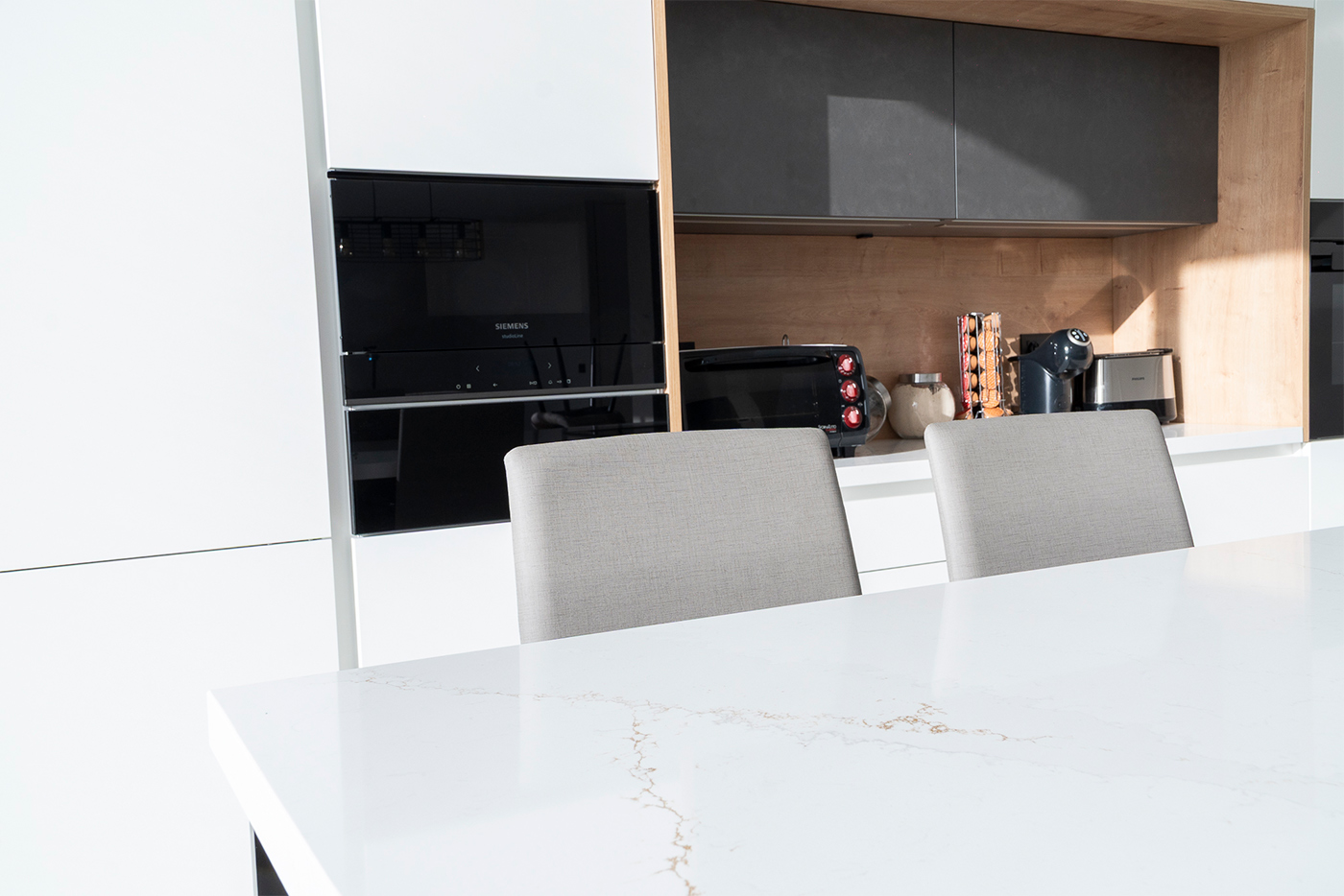 El espacio se completa con electrodomésticos de Siemens Studio Line y soluciones de fregado de Franke, que aportan calidad, tecnología y eficiencia al conjunto, garantizando un rendimiento excelente en el día a día.