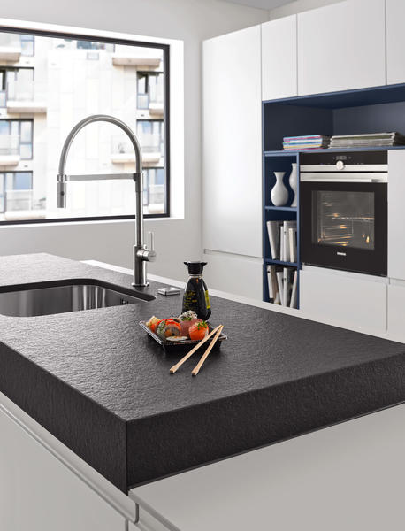 El módulo de fregadero de granito auténtico es el centro de atención de la cocina. El tacto único resalta el encanto natural del módulo. Práctico: el granito resiste incluso los cuchillos más afilados.